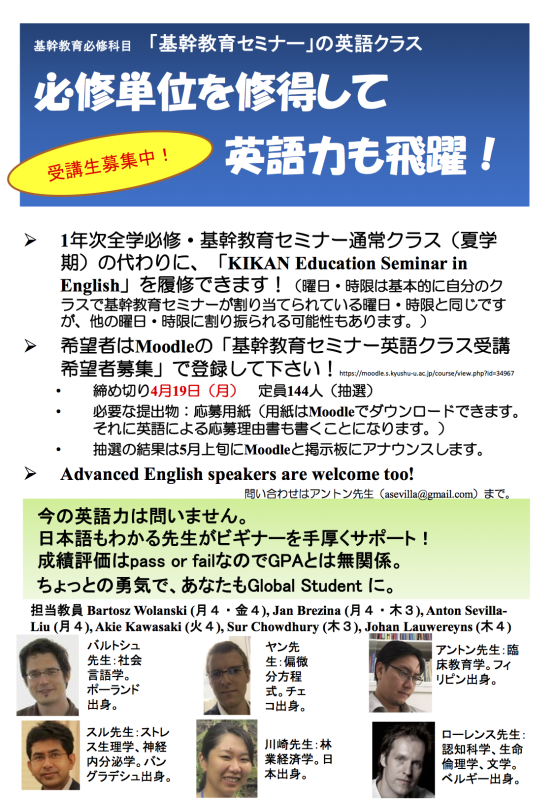This semester, students can take the “KIKAN Education Seminar in English” instead of the regular first-year KIKAN class. All levels are welcome and your grade will not affect your GPA. This is a great chance to take a university course in English! The deadline to register is Monday 19th April. Students can apply via Moodle. https://moodle.s.kyushu-u.ac.jp/course/view.php?id=34967