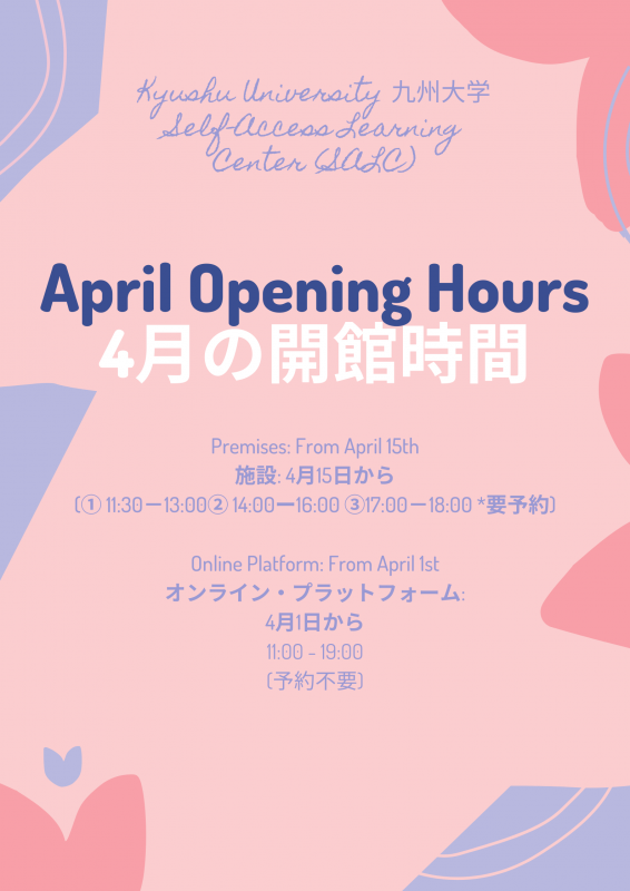 Due to the impact of the new coronavirus, SALC will continue to offer a range of services online (including conversation sessions and one-to-one reservations/consultations). Please be aware that the premises have re-opened as a study space. Online Platform: 11:00 – 19:00 (*no reservation required) / Premises: ① 11:30 – 13:00② 14:00 – 16:00 ③17:00 – 18:00 (*reservation required)