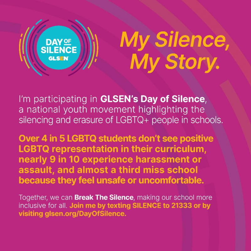 GLSEN – Day of Silence April 23, 2021 The Day of Silence is a campaign aiming to raise awareness about the discrimination that LGBTQ people experience in school. Link: https://www.glsen.org/DayOfSilence