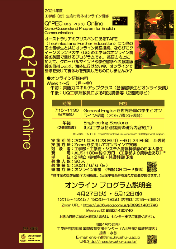 Q2PEC – Online Briefing Session April 26, 2021 Online events will be taking place to give students the chance to find out more about the program. The first sessions will take place on Tuesday 27th April at 12:15 and 18:20.