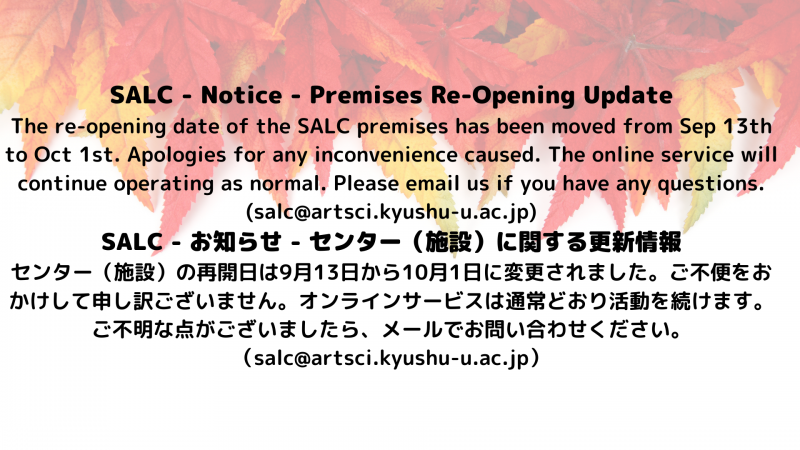 The re-opening date of the SALC premises has been moved from Sep 13th to Oct 1st. Apologies for any inconvenience caused. The online service will continue operating as normal. Please email us if you have any questions. (salc@artsci.kyushu-u.ac.jp)