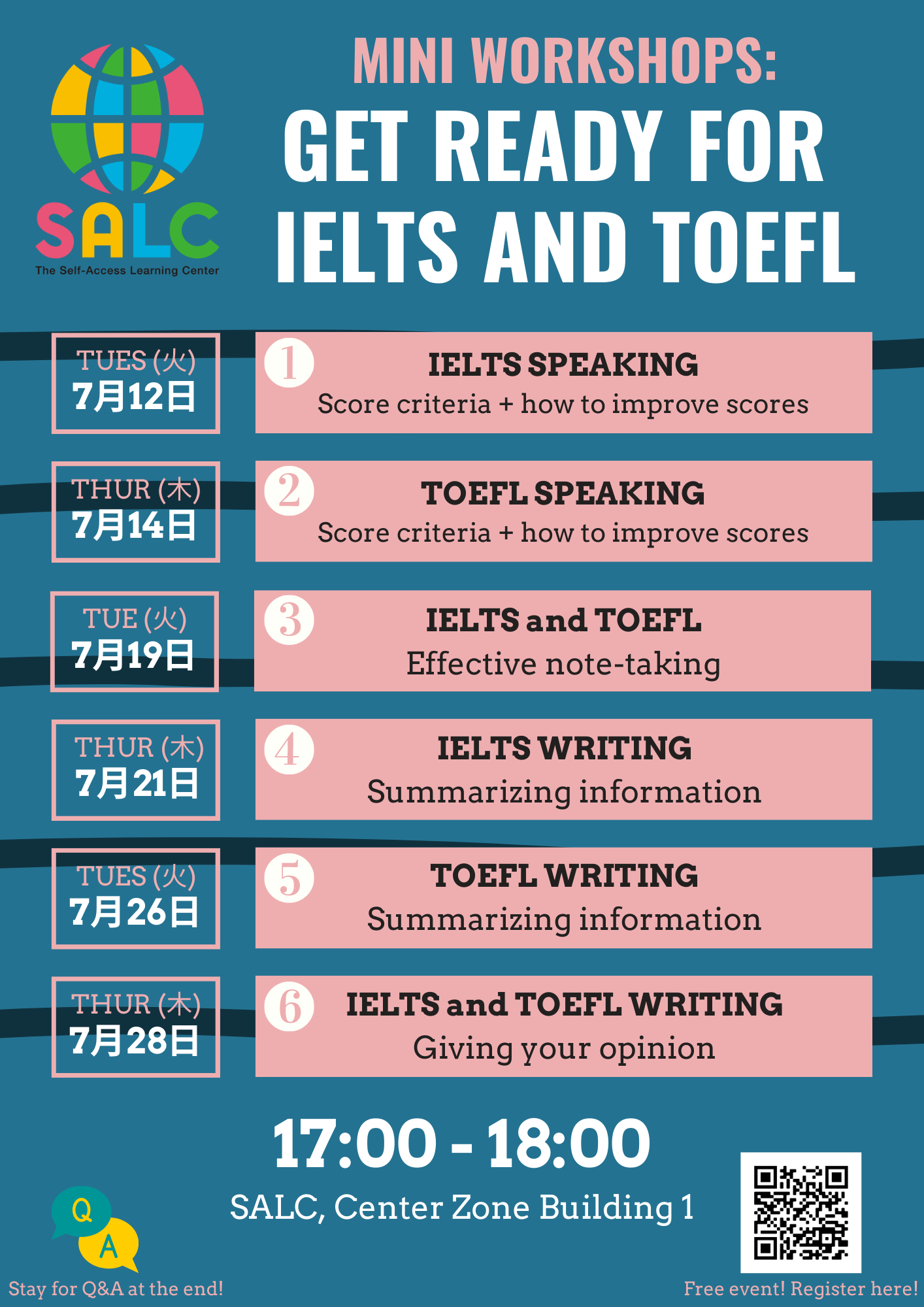 IELTS & TOEFL iBT Workshops – Exam Preparation June 10, 2022 In July, SALC will hold a series of workshops to help students prepare for IELTS and TOEFL. Please join if you are interested in taking one of the tests or want to sit one again in order to improve your score! Link: https://forms.gle/MaFTwkMGXYazwtGo6