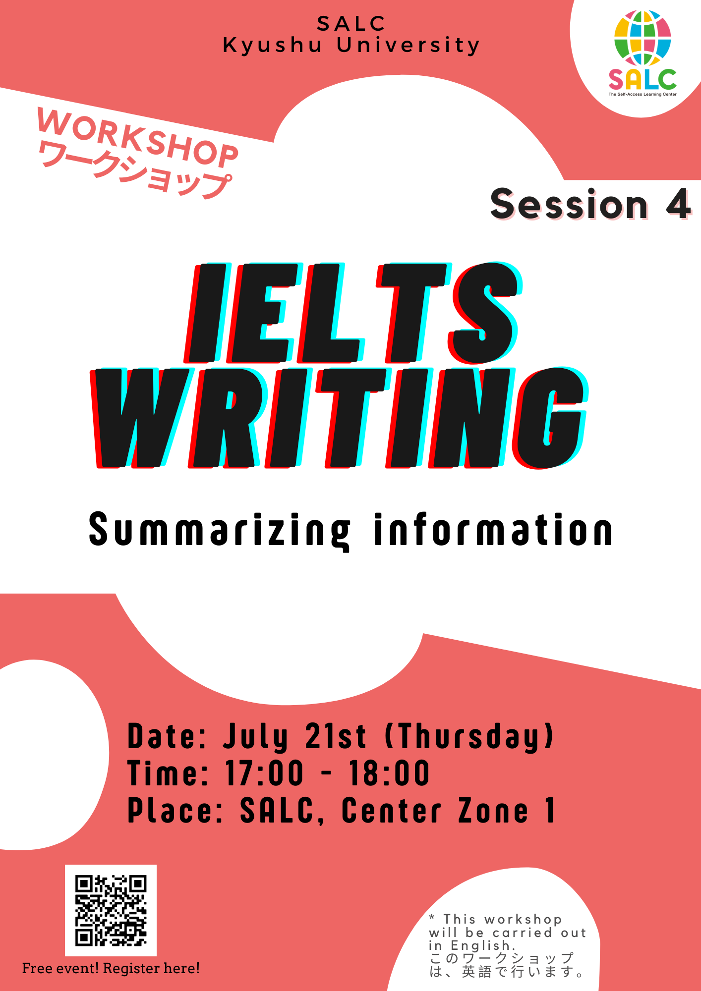 IELTS & TOEFL iBT Workshops – Exam Preparation (Session 4) July 20, 2022 Session 4 is tomorrow (July 21st) from 5:00 pm, at SALC! Register here: https://forms.gle/MaFTwkMGXYazwtGo6 *This workshop will be carried out in English.