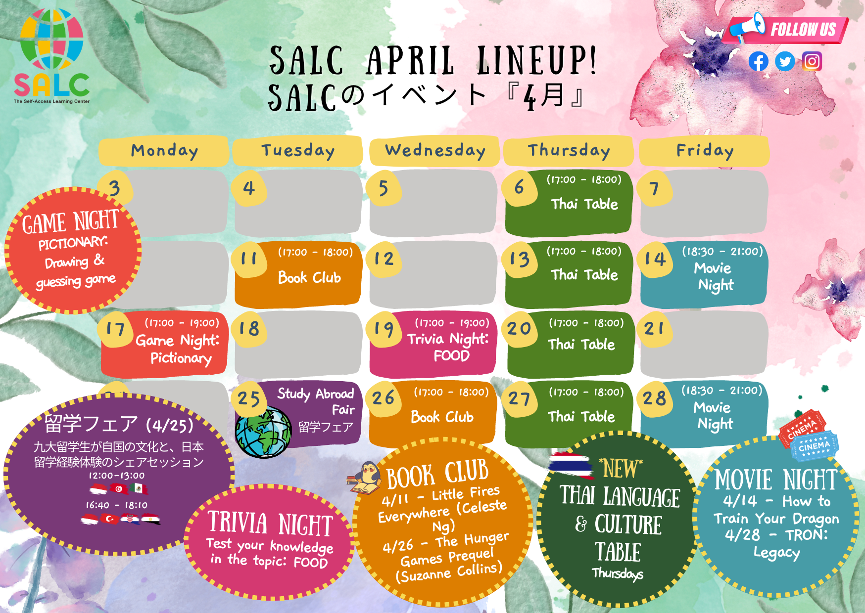 This month, we have Study Abroad Fair, Thai language and culture session, Book Club, Movie Nights, and game and trivia nights.
