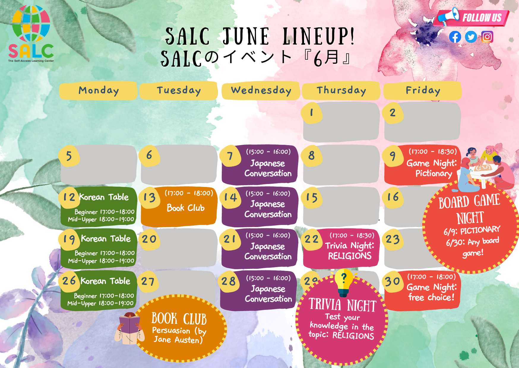 The event schedule at SALC for June is out! This month, we will continue our two language sessions: Korean and Japanese, that you can join to practice speaking in a casual setting! There will also be a Book Club, Board Game events, and Trivia Game night!