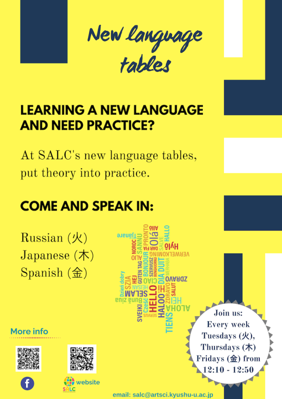 Interested in studying Japanese, Russian, or Spanish? SALC will be holding language tables in Japanese, Russian, and Spanish during lunch times throughout the semester! This is a great opportunity to try practicing a new language with native speakers! All levels are welcome to join!