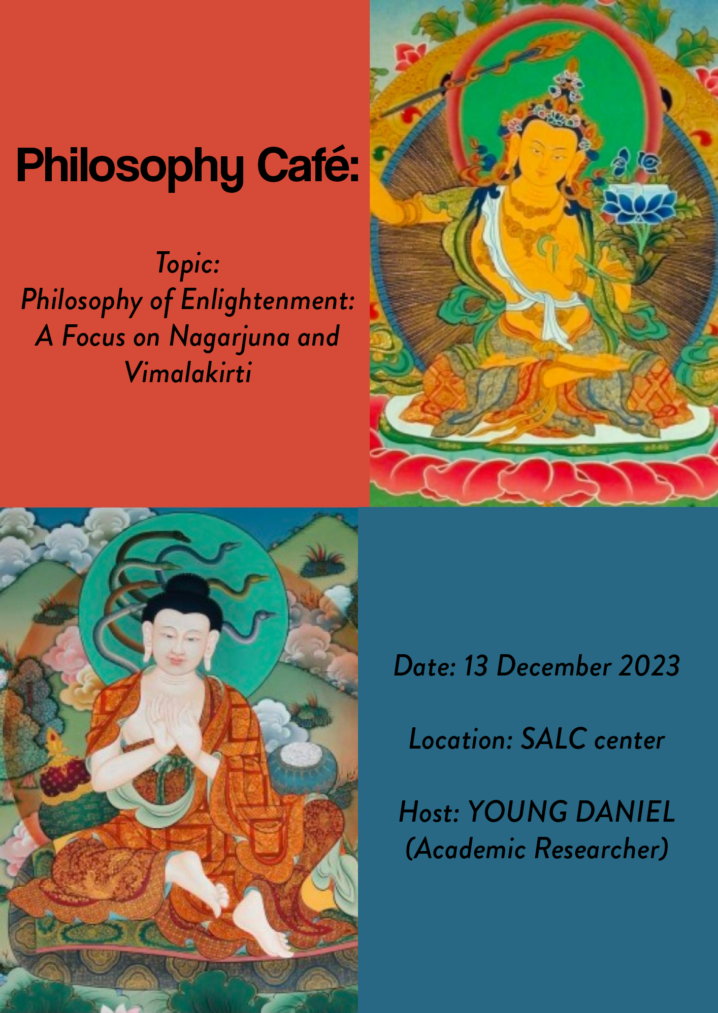 The Philosophy Café, focusing on “Nagarjuna and Vimalakirti’s Paths to Enlightenment,” was held at the SALC Center on December 13, 2023. This event marked a significant success, co-hosted by academic researcher Young Daniel and Saatvik, an esteemed Buddhist scholar from India. It attracted a diverse audience, fostering deep discussions on Buddhist philosophy, with a unique feature of incorporating teachings in both English and Hindi. Objectives and Goals Achieved The event aimed to delve into the teachings of Nagarjuna and Vimalakirti, emphasizing their applicability in modern life. The goals were achieved with outstanding success, as evidenced by: Dual-Language Presentation: Saatvik’s contribution of delivering part of the lecture in Hindi enriched the understanding for Hindi-speaking attendees. Cultural Integration: Saatvik’s insights brought an authentic Indian perspective to the teachings, enhancing the overall experience. Broad Audience Engagement: The bilingual approach expanded the reach of the event, catering to a more diverse audience. Highlights of the Event Collaborative Lectures: Young Daniel and Saatvik jointly presented the philosophies, blending Western academic perspectives with traditional Indian insights. In-depth Analysis: Both hosts provided a comprehensive understanding of ‘Shunyata’ (Emptiness) and the integration of spiritual wisdom in daily life. Interactive Learning: The event featured interactive sessions, encouraging discussions and debates in both English and Hindi. Conclusion The Philosophy Café on Nagarjuna and Vimalakirti’s Paths to Enlightenment was not just a philosophical discussion, but a cultural bridge, bringing together Eastern and Western perspectives. The collaboration between Young Daniel and Saatvik was instrumental in the event’s success, deeply resonating with a diverse audience.