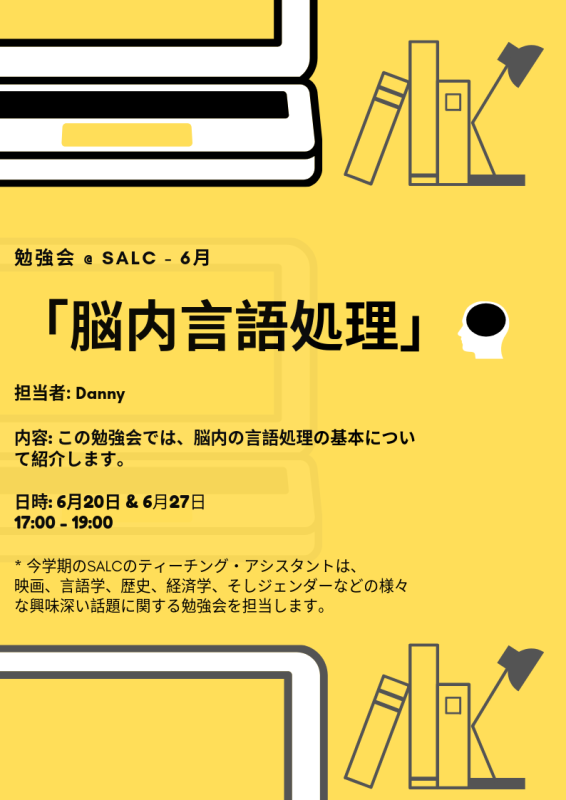 SALC teaching assistant and Kyushu University graduate student Danny lead a study group about neurolinguistics. This session covered the very basics of language processing in the brain. Participants learned how different parts of the brain work together to use language. The discussion also went over some of the physical changes that take place in the brain as people learn a new language.