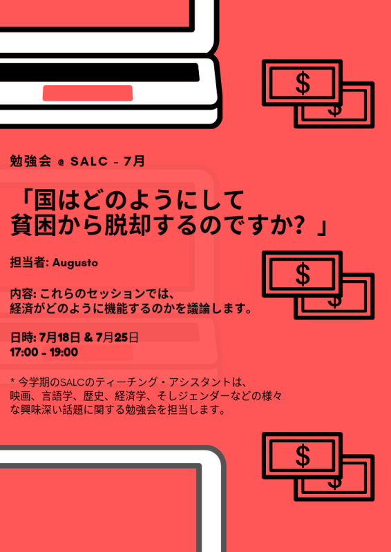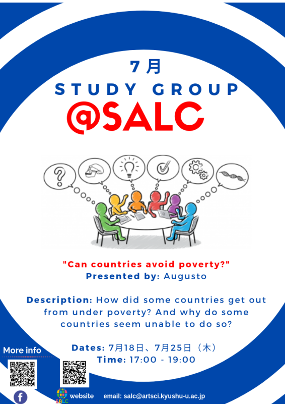 SALC teaching assistant and Kyushu University graduate student Augusto ran a study group about economics. During these sessions, students learned how economies function. Augusto also spoke about how some economies have been able to upgrade their status while others have failed.